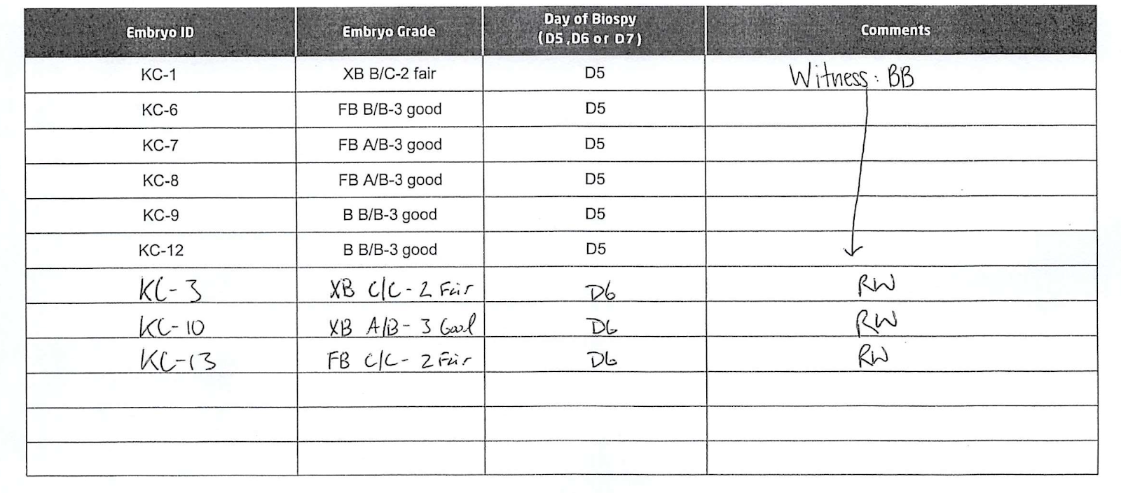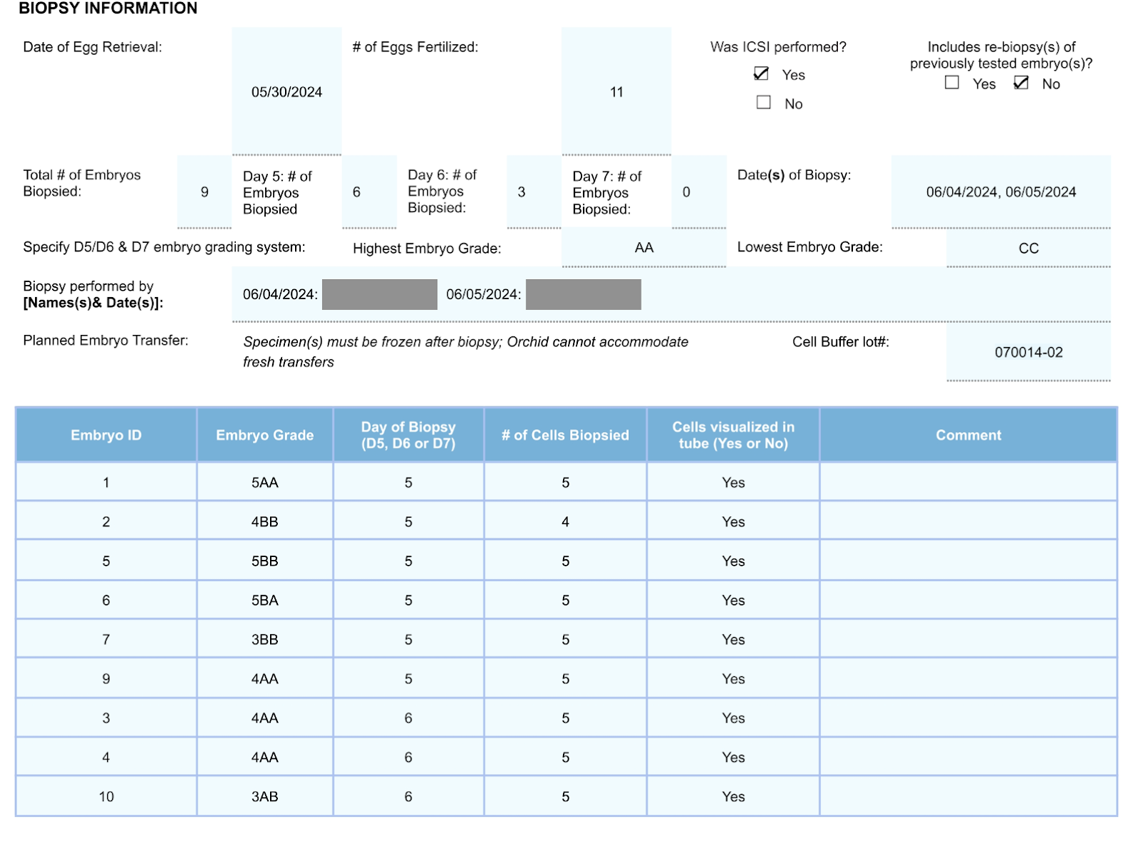 We retrieved 13 eggs; 11 of those eggs were mature and successfully fertilized. 9 of those embryos developed enough to be biopsied; Kindbody performed a standard embryo biopsy and shipped the biopsies to Orchid for PGT-WGS testing.