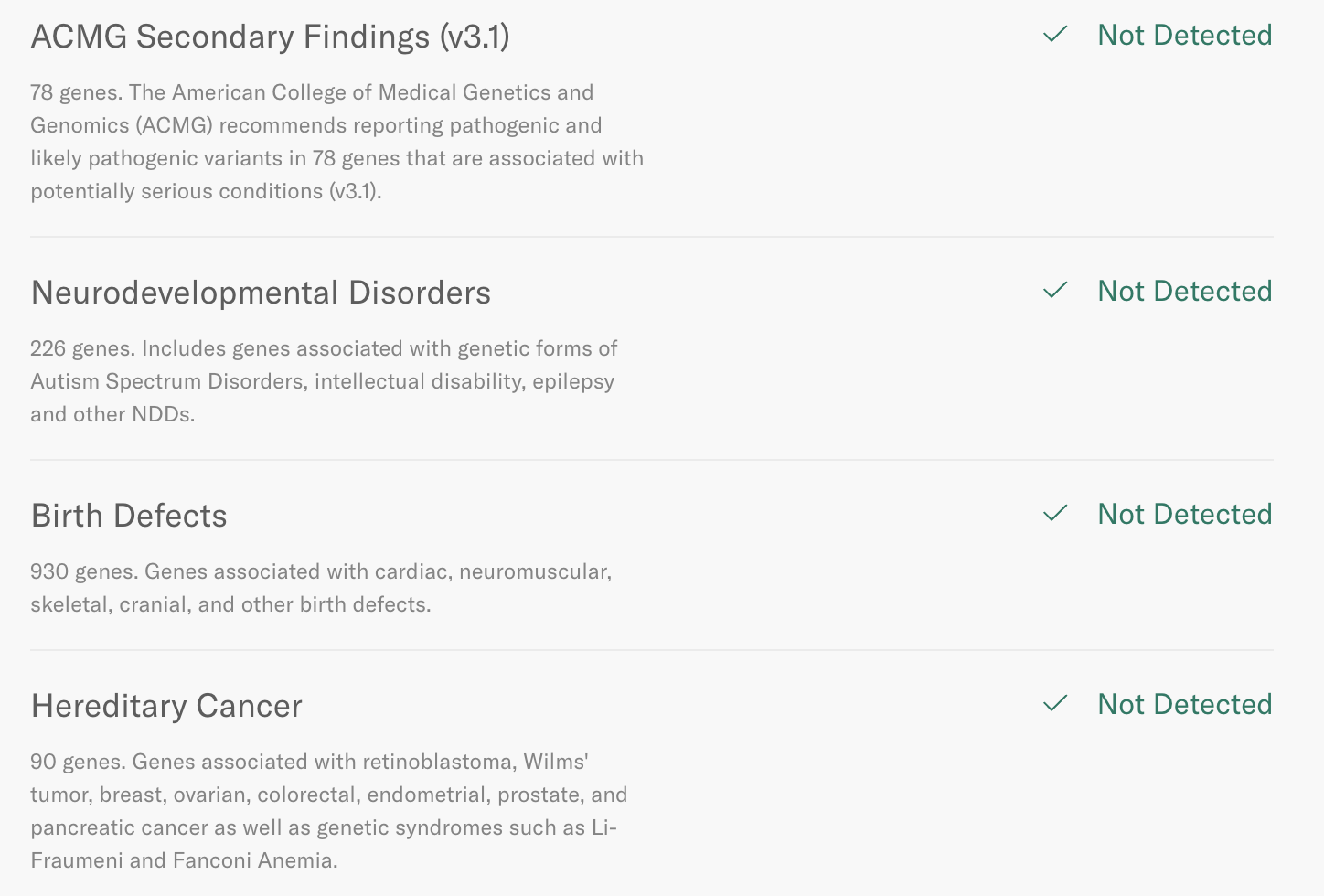 - Monogenic screening on the ~1,200 genes on the Hereditary Cancer, Birth Defect, and Neurodevelopmental Disorder panels gave us a level of confidence that we had reduced the risk of severe genetic disease.