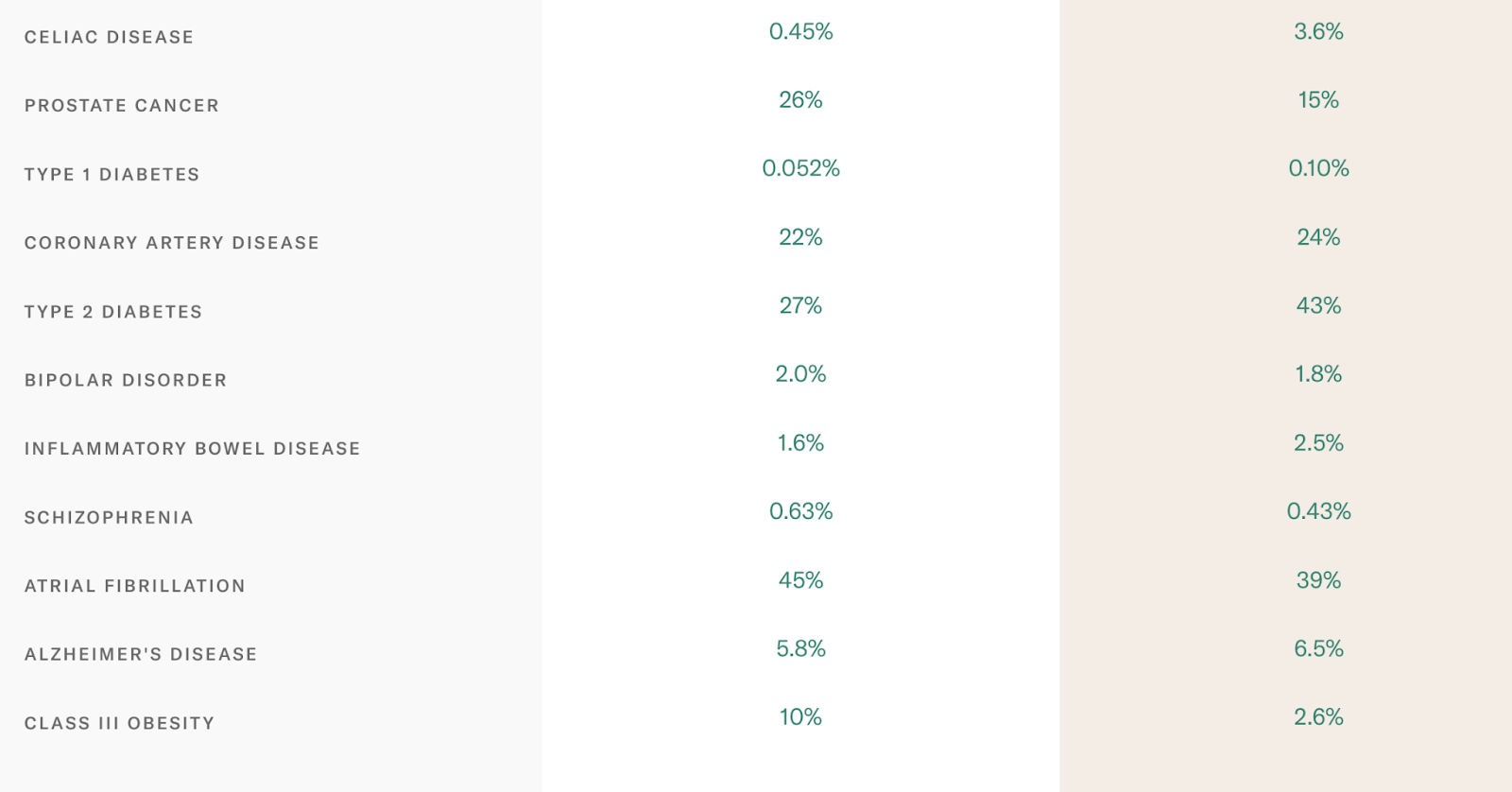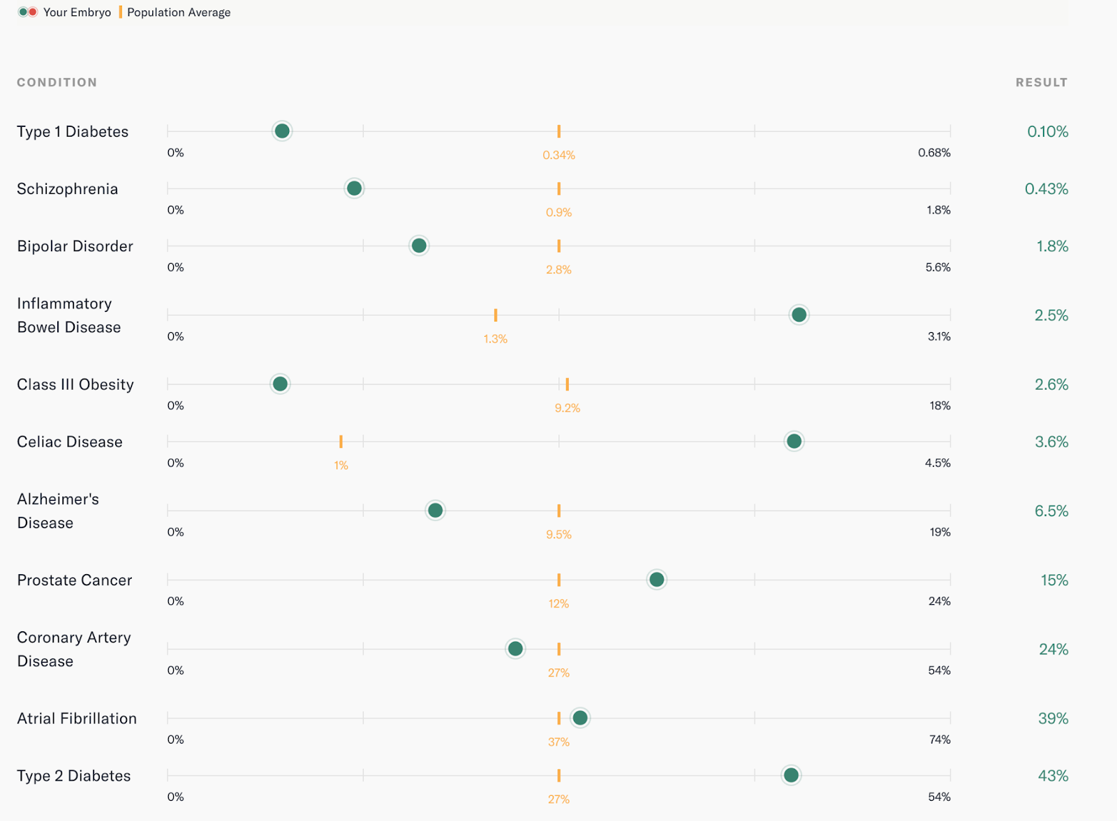 While the whole-genome sequencing data captured during PGT-WGS is primarily used to detect pathogenic variants during the monogenic screening I just described, it also allows us to compute the genetic risk for each embryo, measuring their predisposition to 11 chronic diseases (many of which are adult-onset). This testing is optional, if parents feel comfortable with the extra information available.
