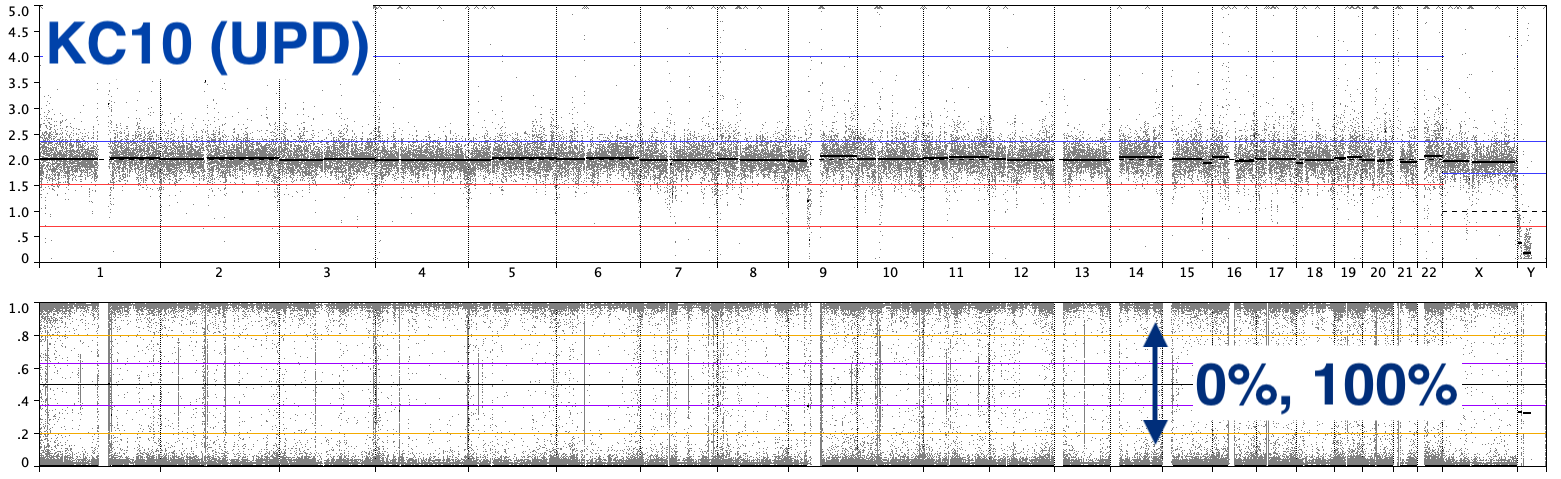 (To go a bit deeper. If you only look at chromosome counts, KC10, an embryo with UPD looks very similar to KC9, a euploid female — each embryo has two copies of each chromosome, the top plot in each figure.