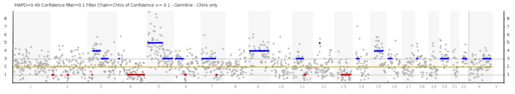 On the PGT-A plot, this means that chromosomes 1-22 should have points centered on the “2” line of the CN plot. Males will have a signal of “1” for the X chromosome and “1” for the Y chromosome, while females will have an X at “2” and little to no signal for the Y chromosome. Small variations above and below are due to difficulty in sequencing DNA from the 3-5 cells in an embryo biopsy.)