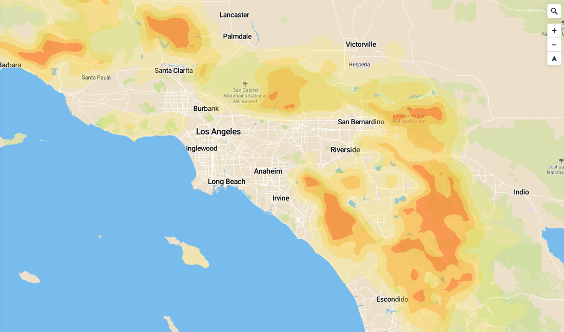 Earthquakes: I was able to fairly directly translate earthquake data into hazard bands based on the USGS input data. The units here takes a bit of work to wrap your head around (“peak acceleration as a % of gravity”), but it was easy enough to break this data into four bands: 10-20, 20-50, 50-70, and 70+