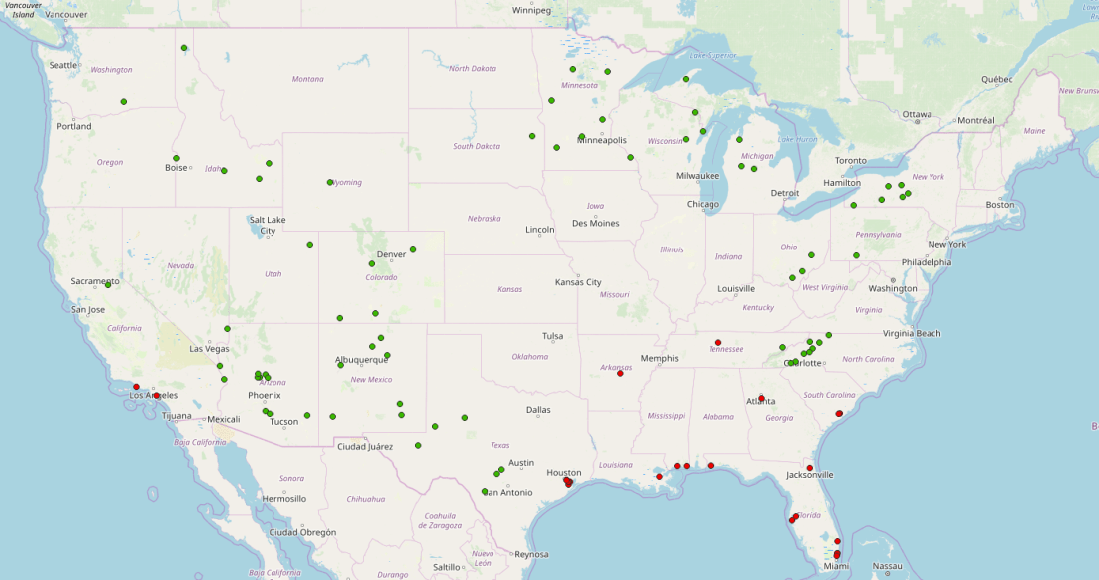 So, crunched all of the above data, and found…. 72 cities of 10,000+ people with no measurable risk, by those metrics. Here’s the map: